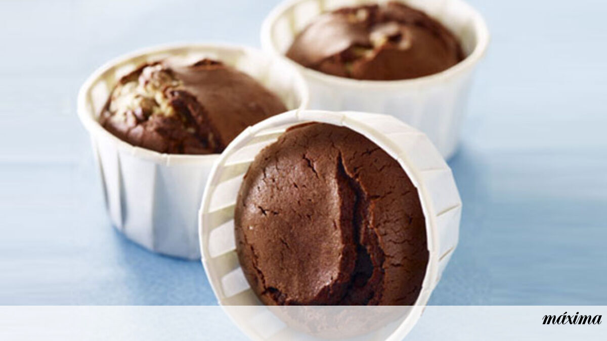 Pré-aqueça o forno a 180°C (termóstato: 6). Separe as gemas das claras. Derreta o chocolate com 1 colher de sopa de água, em lume brando. Deixe arrefecer e junte 3 gemas de ovos, a margarina, a fécula de milho e o edulcorante. Bata as 4 claras em castelo firme com a pitada de sal e incorpore-as na mistura. Forre quatro formas com papel sulfurizado ou utilize formas de silicone. Deite um pouco de preparado no fundo, junte os quadrados de chocolate branco e cubra com o resto da massa até três quartos de altura da forma. Leve ao forno durante 10 minutos e sirva de imediato.