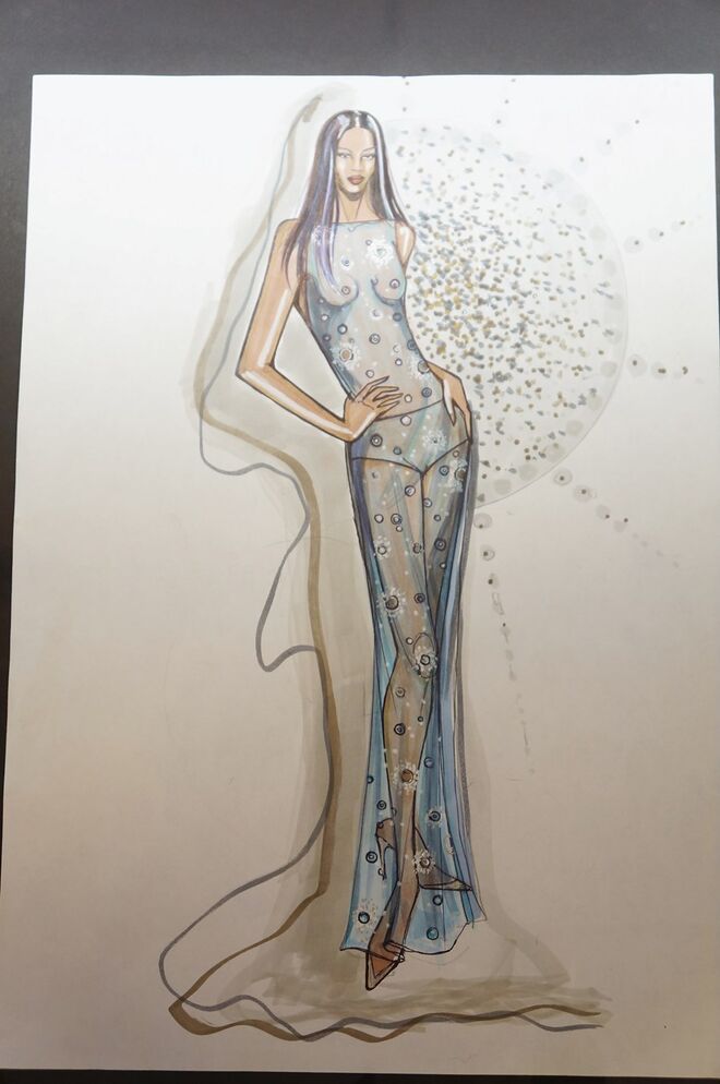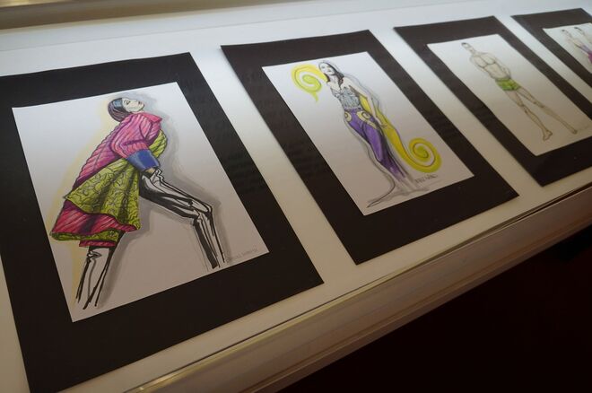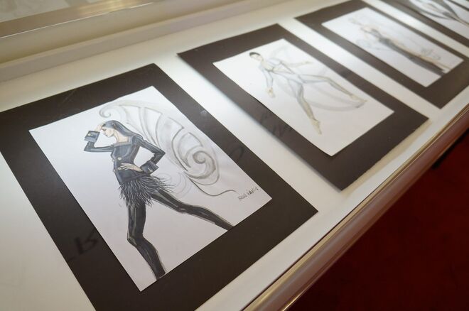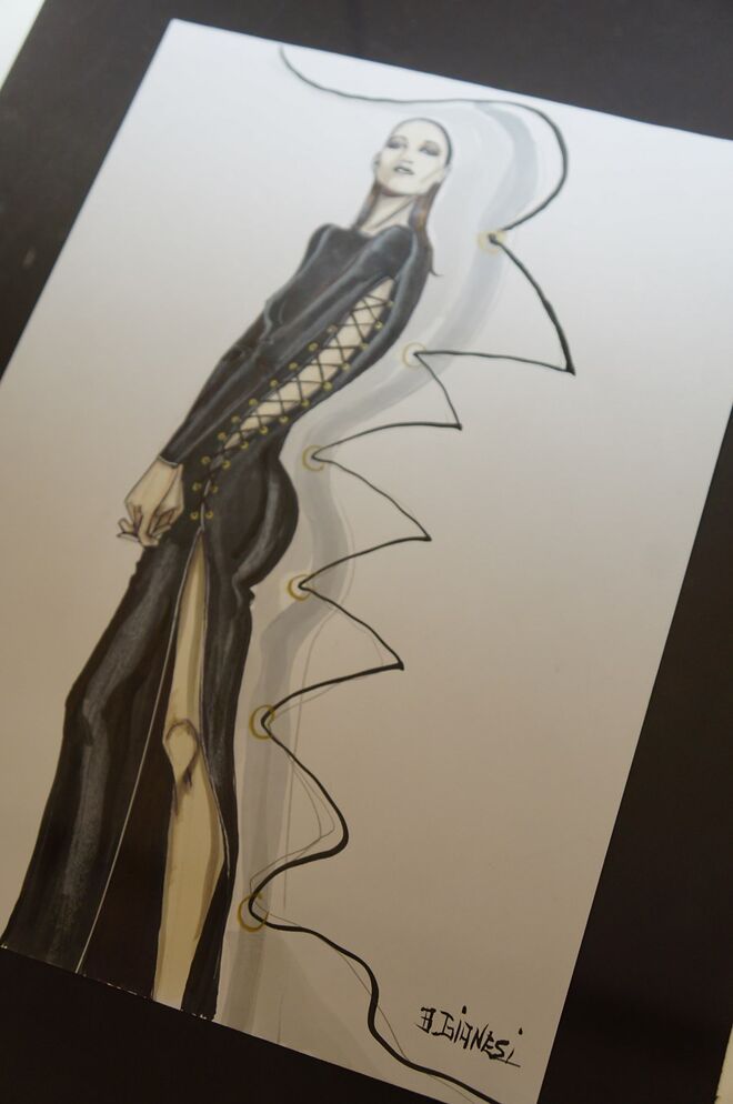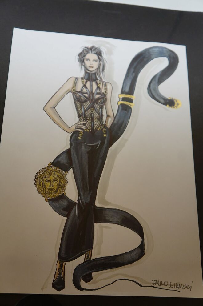 Num canto da exposição é possível ver croquis originais de Bruno Gianesi, que trabalhou como primeiro assistente de Versace de 1984 a 1997 e foi chefe de estilo do escritório e responsável pelos projetos teatrais da casa de luxo italiana.
