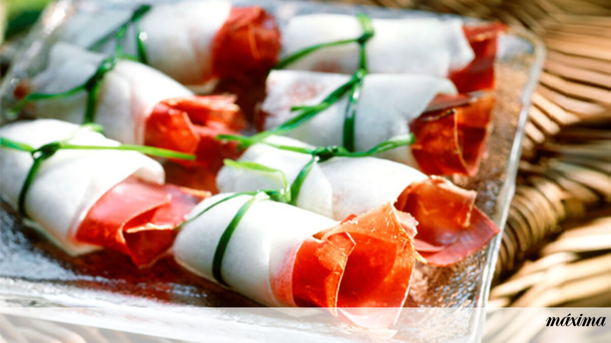 Corte, descasque e retire as pevides do melão. Com um cortador faça 8 tiras finas. Escalde os talos de cebolinho em água a ferver, deixe uns minutos e escorra. Coloque as fatias de meloa numa tábua, disponha o presunto em cima e enrole para formar pequenos rolos. Ate cada rolo com um talo de cebolinho e coloque num prato de servir. Faça um vinagrete com o sumo de limão, azeite, sal, pimenta e mel a gosto e espalhe sobre os rolinhos. Sirva imediatamente.