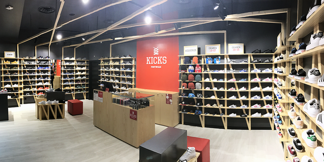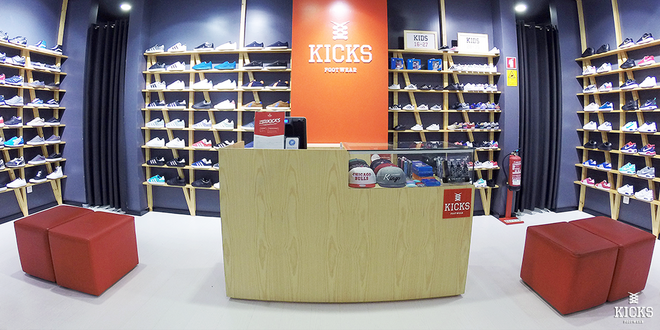 A marca abriu a sua primeira loja no Porto, no C. C. Parque Nascente, em Rio Tinto. As restantes lojas situam-se em Viseu, no Fórum Viseu, em Castelo Branco, no Fórum Castelo Branco, em Braga, no C. C. Nova Arcada, em Santarém, no W Shopping, e em Viana do Castelo, no Shopping Estação Viana. Este ano, a KICKS também lançou a plataforma de venda online.