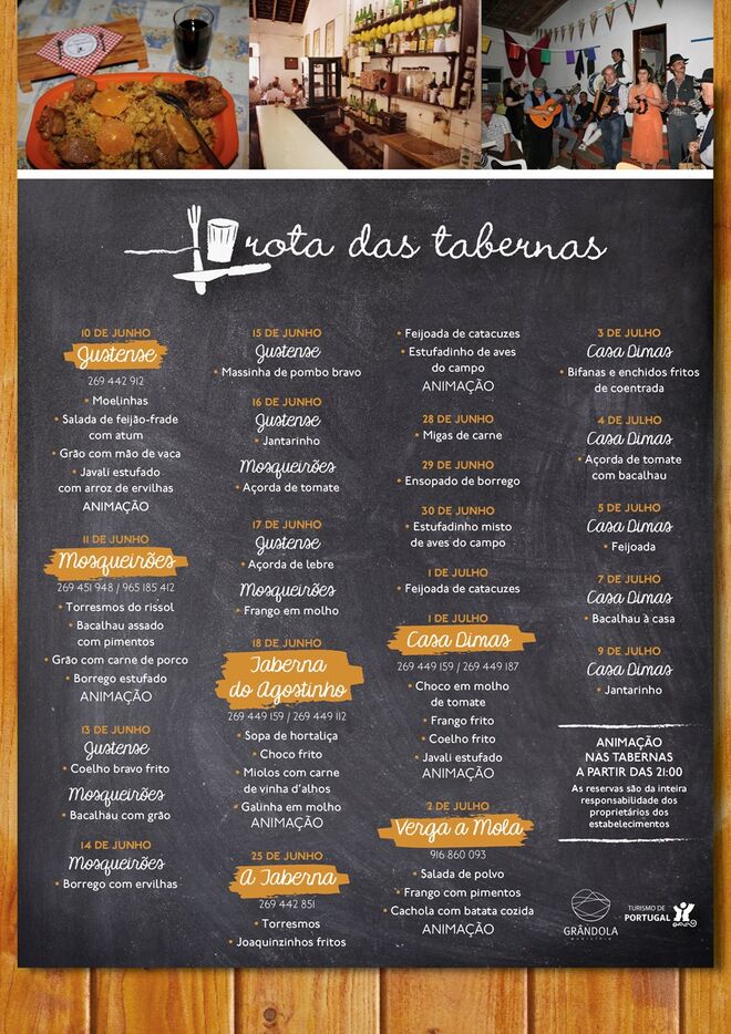 Durante este período a iniciativa do Município de Grândola, com o apoio do Turismo de Portugal, promove a gastronomia regional e dá a conhecer a tradição musical da região. Gustense, Mosqueirões, Taberna do Agostinho, A Taberna, Casa Dimas e Verga a Mola são as seis tabernas aderentes à Rota vai ouvir-se o cante alentejano e grupos de música instrumental do cancioneiro tradicional alentejano.