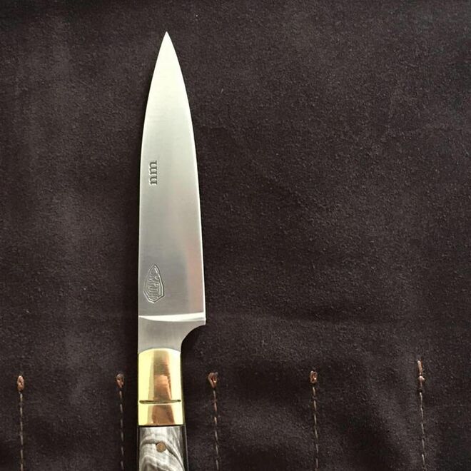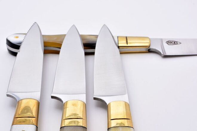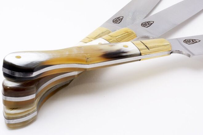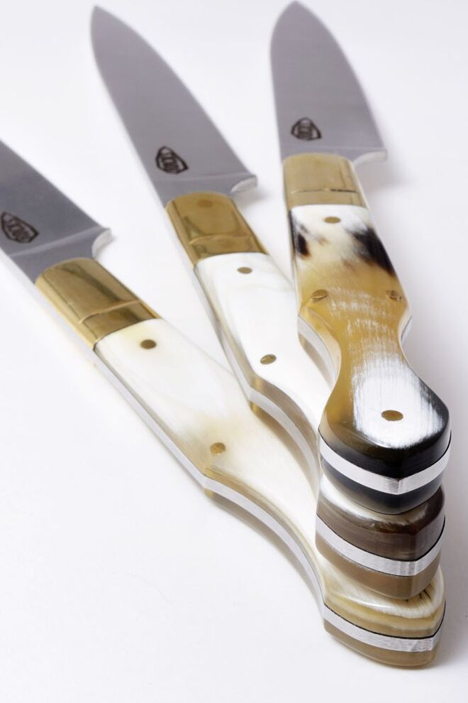 No que toca a materiais utilizados, convém saber que as facas de mesa têm lâmina em aço inox sandevic e as facas de chef são em aço damasco. Já os cabos variam entre madeira de oliveira ibérica estabilizada, madeira de ébano angolano, com 30 anos de secagem, madeira de pau violeta ou kingwood; acrílico transparente vazado com tela de cortiça e chifre bovino. A especificidade dos materiais exige cuidados: as facas com cabos em madeiras e chifre não devem ser lavados na máquina. O latão vai escurecendo com o tempo, mas renova-se facilmente com qualquer limpa metais. O cabos em madeira devem ser esfregados regularmente com um óleo natural ou cera, para manter o seu isolamento à humidade.