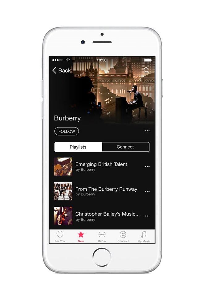 A Burberry torna-se hoje a primeira marca global a lançar um canal dedicado no Apple Music. O canal Burberry vai centrar-se na secção Curators" do serviço Apple Music. Este canal irá apresentar colaborações exclusivas da Burberry com artistas britânicos, emergentes e icónicos, com performances, músicas e filmes, juntamente com listas de reprodução regulares, celebrando assim o grande talento musical britânico, tanto do passado como do presente.