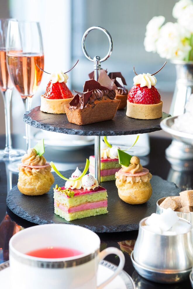 Primeiras impressões: os sofás tão fofos que podíamos ficar refastelados neles a tarde inteira. Por isso mesmo é que será melhor ir com tempo, porque a ideia é desfrutar e saborear e devagar. O Afternoon Tea (servido todos os dias das 15h30 às 18h) está disponível em duas versões: a Classic (€12/pessoa), para estômagos mais pequenos e/ou menos gulosos, e a Signature (€22/pessoa), que é uma versão alargada da primeira. Naturalmente, escolhemos a segunda opção (um dia não são dias e já que a tarde estava reservada ao ritual do chá, nada melhor do que cumpri-lo a preceito). Recostámo-nos no sofá e assistimos ao desfilar de tentações: três variedades de scones com manteiga e compotas, finger sanduíches de pão escuro com salmão e de foccacia com legumes grelhados e pesto. Depois, os doces: Financier de Chocolate (cremoso e suave na medida certa), Tartelete de Frutos Vermelhos (o morango trouxe um toque bem refrescante ao lanche), Pavê de Pistáchio e Framboesa e, finalmente, o nosso preferido, o Profiterole Cremoso que, só por si, justifica a viagem.