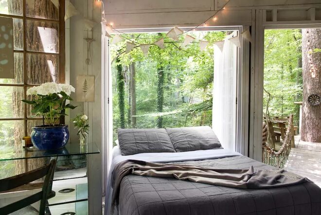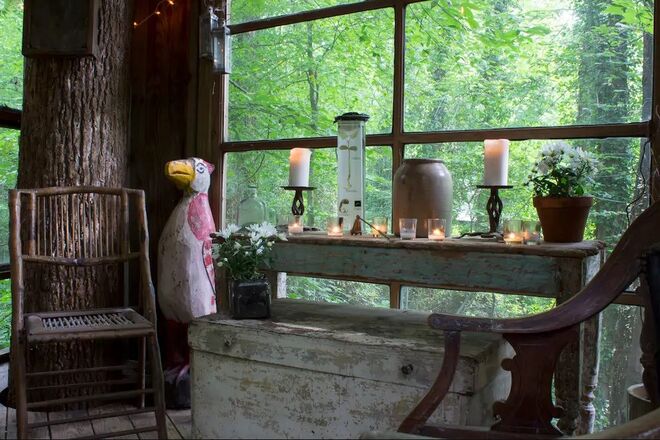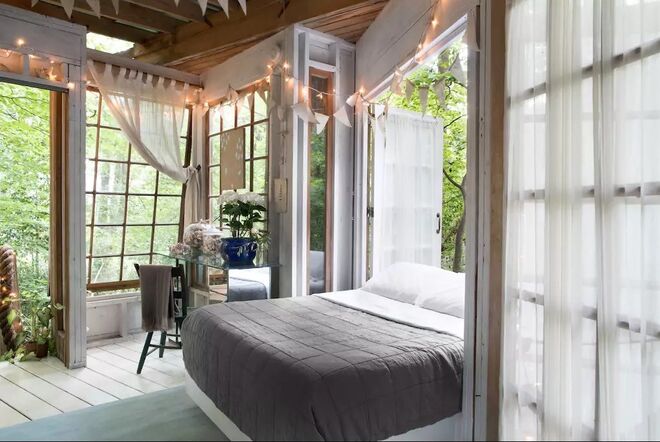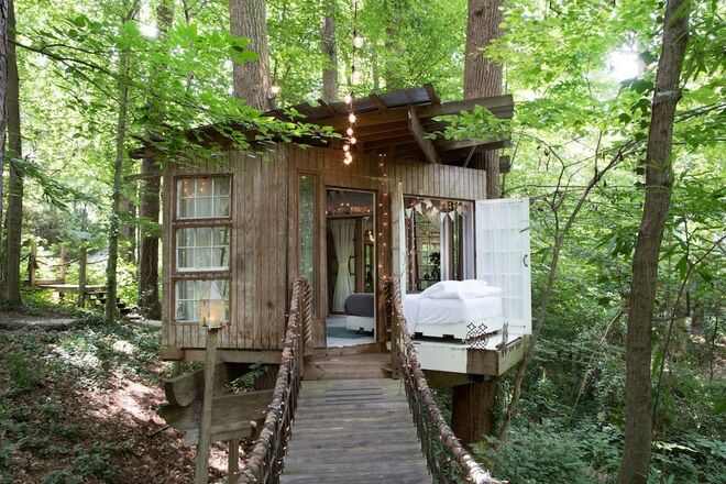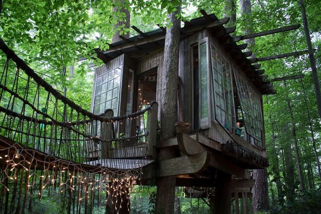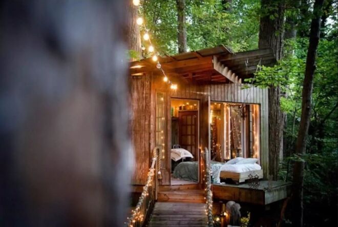 Não é um castelo luxuoso, uma casa de praia ou uma mansão moderna, é uma casa na árvore para dois.