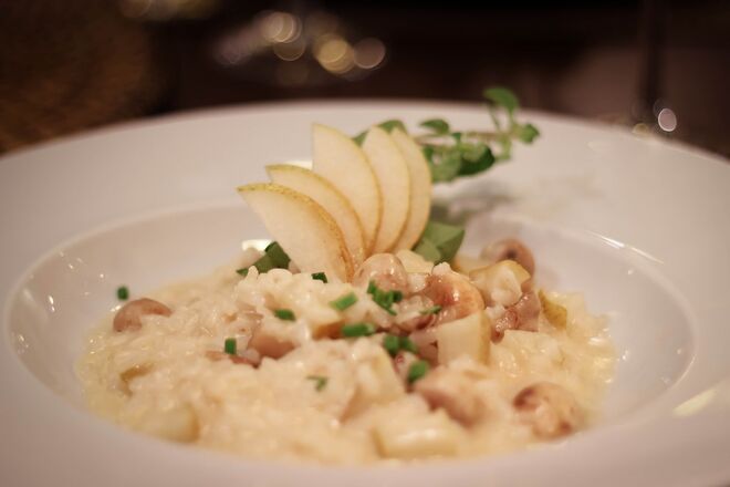 Prato Principal - Gamba de Caril com Arroz de Canela e Côco, Chutney de Ananás e Manga Caramelizada Ou Saltimboca de Frango, Batata Doce em 2 texturas, Espargos Grelhados e Cogumelos salteados em Aromas de Porto