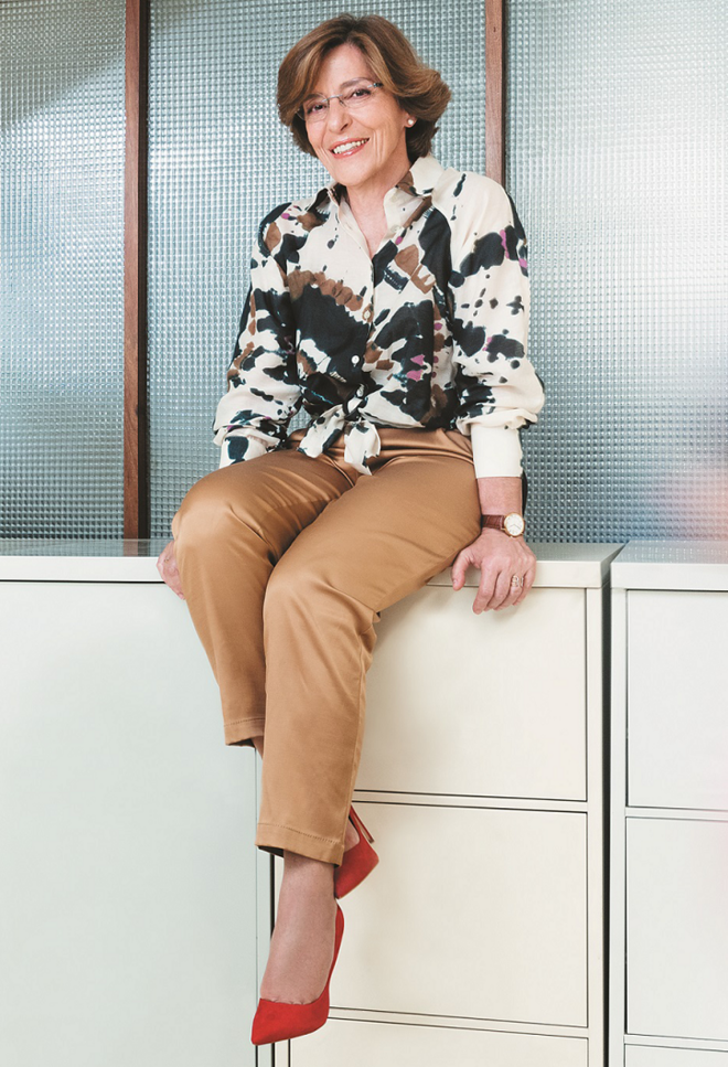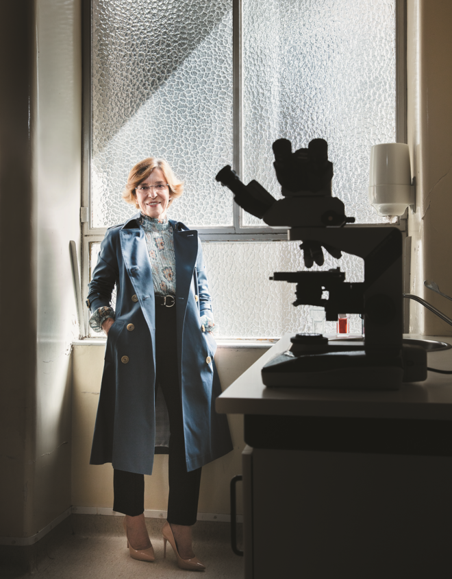 Em cima da secretária, Fátima Carneiro tem precisamente um microscópio, ao lado do qual repousam as caixas com as análises desse dia, que aguardam a avaliação do olho clínico desta profissional. "Juro-lhe que até ir para casa está tudo feito, nem que saia daqui tardíssimo", assegura, durante uma agradável conversa que se estende por mais de uma hora. Mãe orgulhosa e recém-avó deslumbrada, Fátima é, desde 2001, diretora do serviço de Anatomia Patológica do Centro Hospitalar São João, no Porto. Atualmente é ainda investigadora no Ipatimup e no i3S (Instituto de Investigação e Inovação em Saúde) e diretora da Unidade de Patologia e Oncologia na Faculdade de Medicina da Universidade do Porto, onde também é professora catedrática. Foi presidente da Sociedade Europeia de Patologia (2011-2013) e, em Portugal, coordenou a Rede Nacional de Bancos de Tumores (2008). Desde 2017 que preside a Academia Nacional de Medicina Portuguesa. Além de cargos de excelência, são muitas as suas conquistas profissionais nacionais e internacionais, tendo ganhado vários prémios assinaláveis ? como a distinção de Grande Oficial da Ordem Infante Dom Henrique, atribuída por Aníbal Cavaco Silva, em 2006, ou o Prémio Seiva nas Ciências, em 2017 ? e participado em vários comités científicos mundiais na sua área, além de ser autora de mais de 350 publicações (de natureza diversa). Este ano foi distinguida pela Câmara Municipal do Porto, tendo recebido a Medalha Municipal de Mérito - Grau Ouro, pelo seu contributo para o "bem comum da cidade". Atualmente dedica-se, entre outras áreas, à investigação da etiopatogenia das síndromes hereditárias do cancro do trato gastrointestinal. Rigorosa e incansável, Fátima Carneiro mostra um sentido de humor apurado. "Eu também sei brincar, não tenho é tempo", brinca, face à equipa pouco usual que tem nesse dia à sua frente: um fotógrafo, uma maquilhadora e uma stylist. Apesar de este ser um registo a que não está habituada, lemos-lhe no sorriso que é uma mulher de desafios. E aceitou este com a mesma vivacidade que a define em tudo o resto.