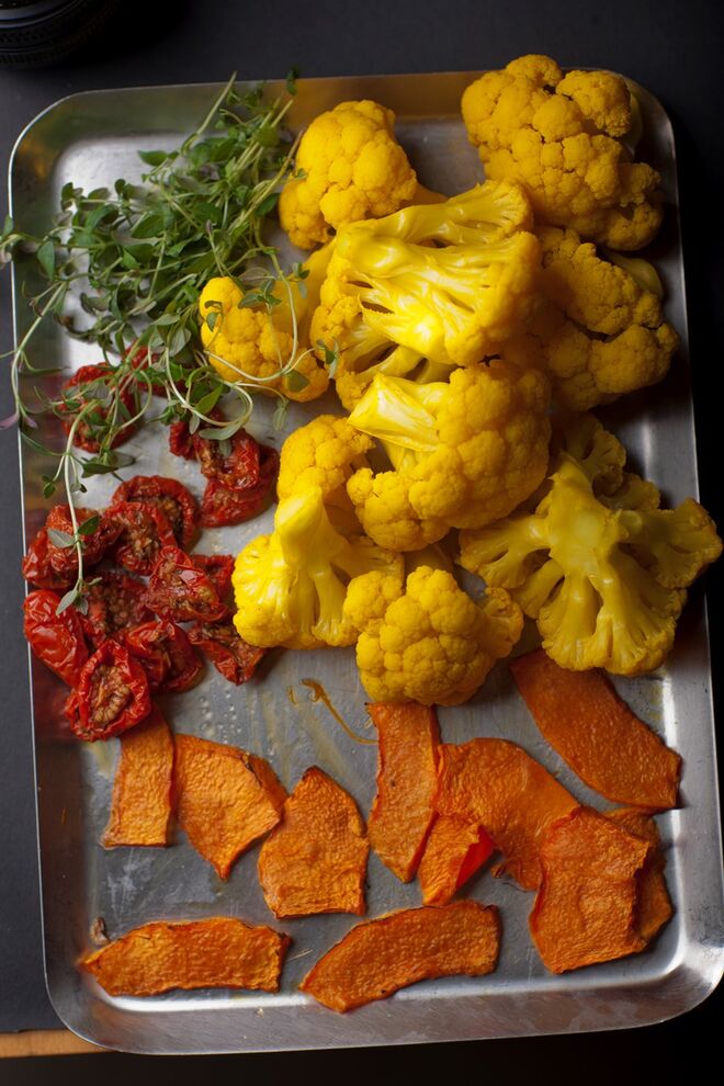 - Quinoa com abóbora assada, espinafres e mousse de queijo de cabra;