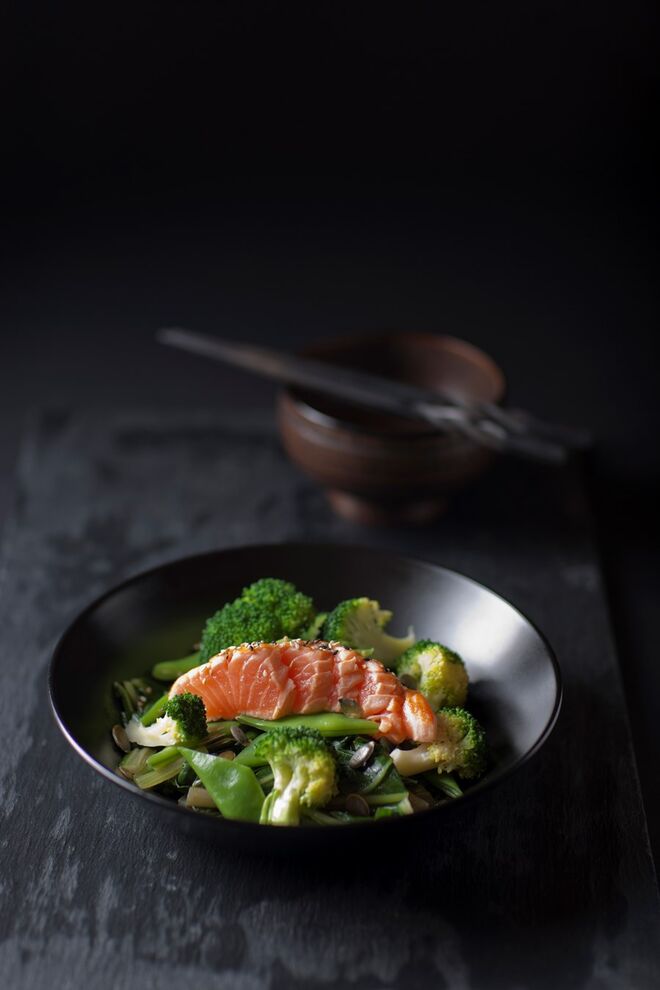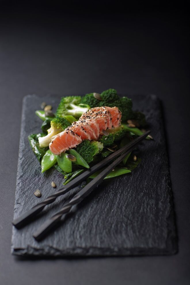 - Tataki de salmão com trilogia de legumes salteados;