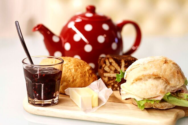 Um chá quentinho à escolha, um scone com compota e manteiga, uma fatia de salame caseiro e uma mini bolinha de água com queijo, fiambre e alface.