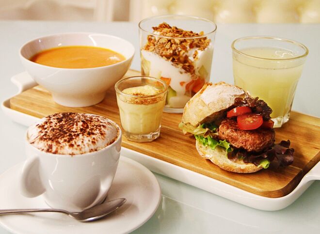 Um sumo do dia, um cappuccino, um copo de iogurte natural com fruta e granola caseira, um mini hambúrguer, sopa do dia e um copinho de sobremesa do dia.