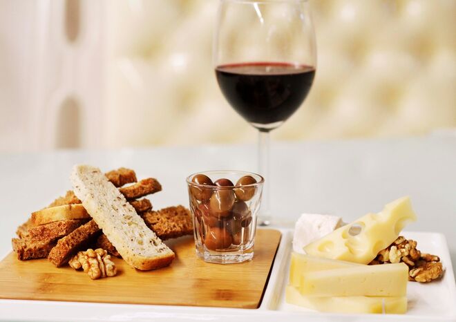 Um copo de vinho tinto ou branco, uma variada seleção de queijos, acompanhados com pão simples e tostado, azeitonas e nozes.