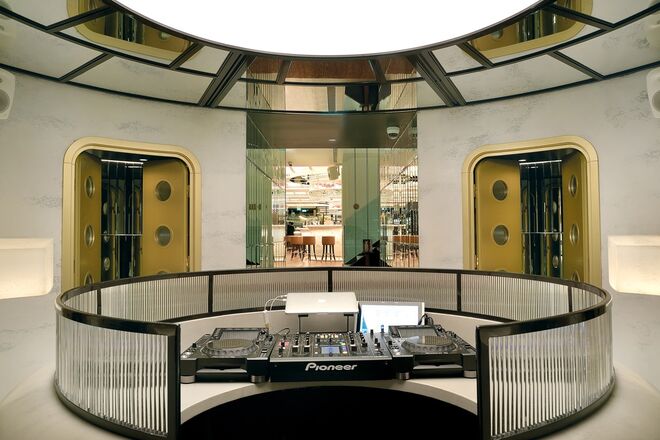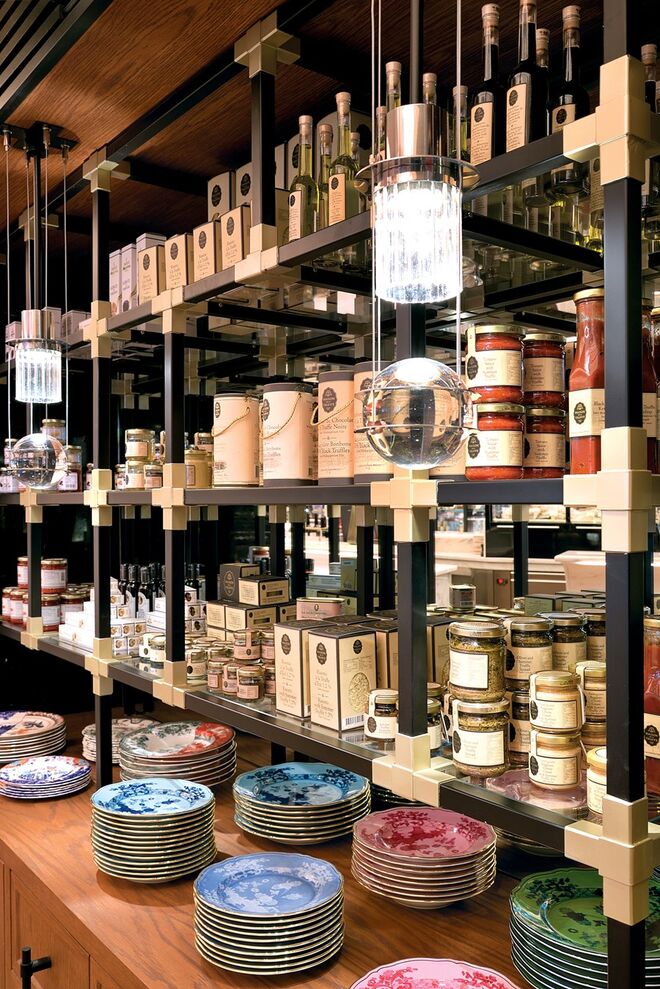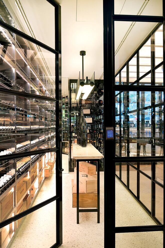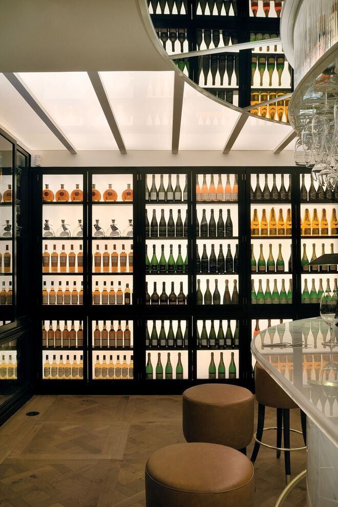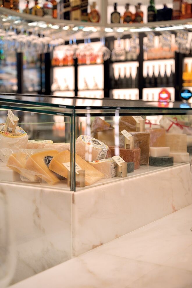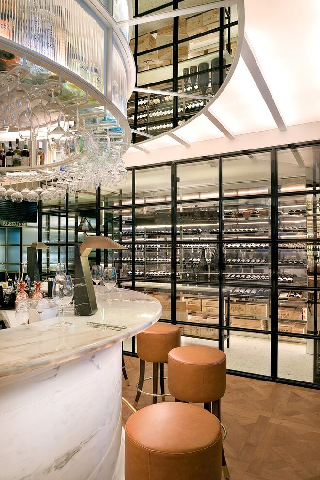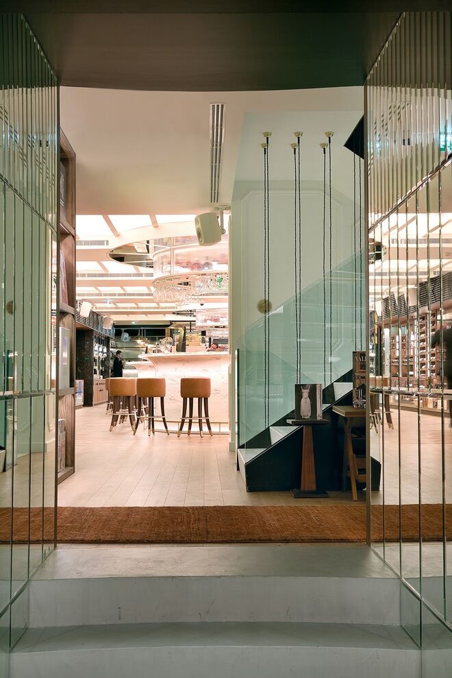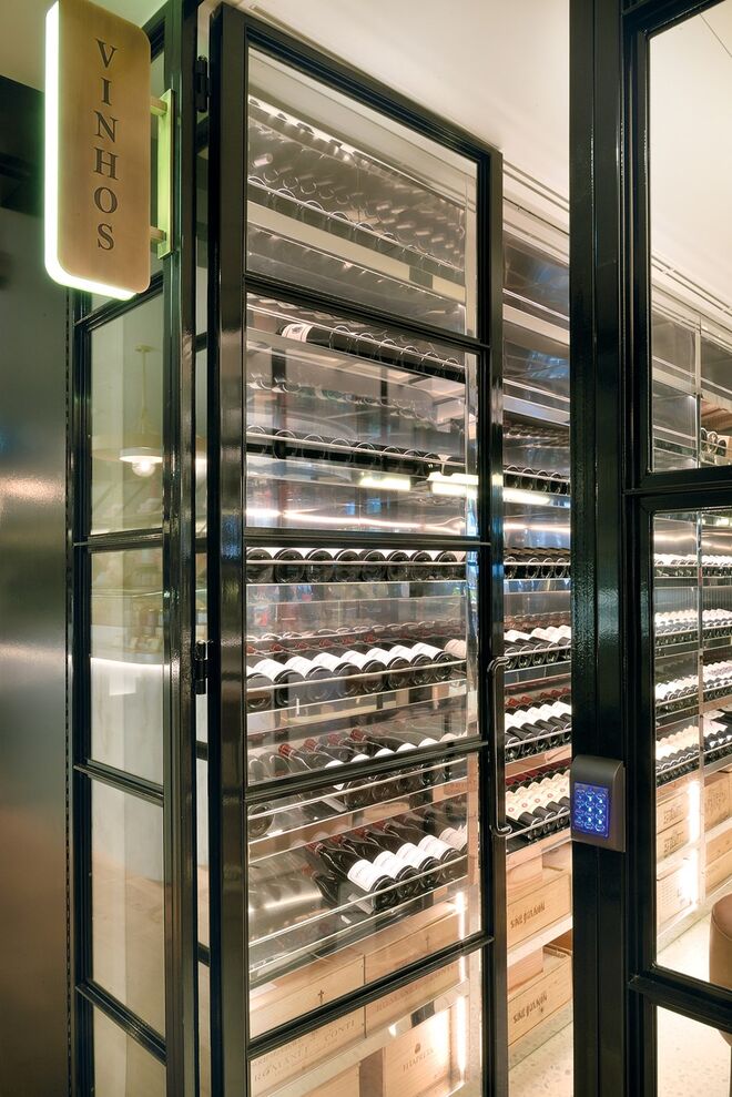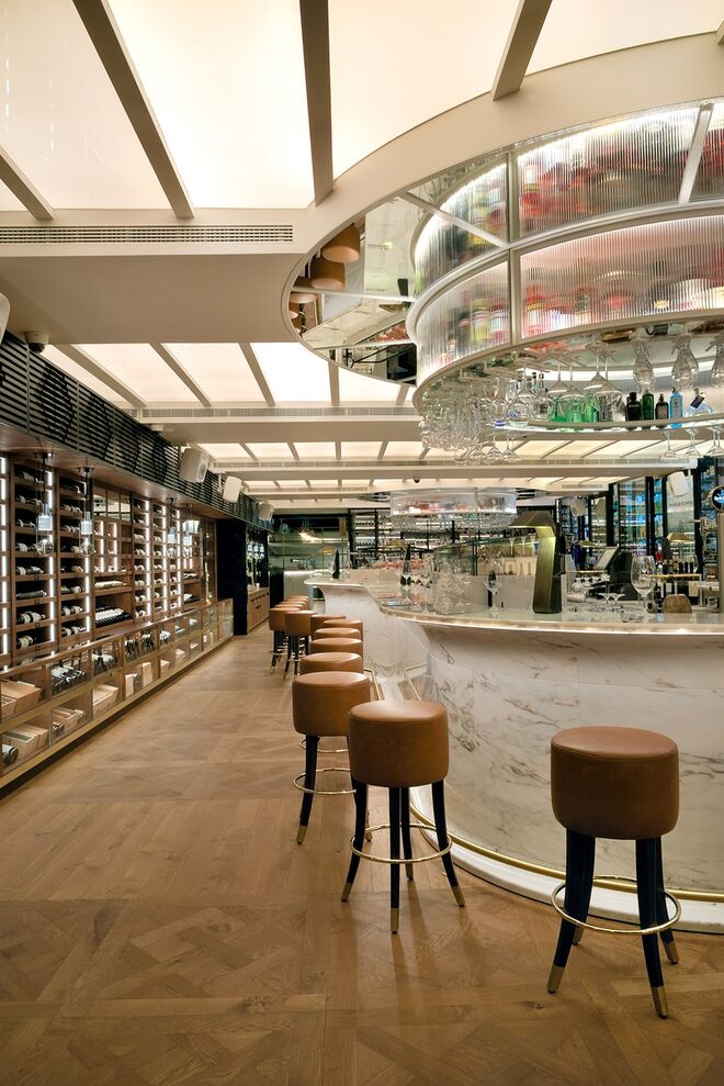 O piso intermédio é composto por um bar-balcão de 42 lugares, o Delibar, que convida a refeições mais ligeiras e onde pode desfrutar de uma longa carta de vinhos e cocktails. Logo ao lado existe uma sala climatizada pronta a receber provas de vinhos, uma mercearia gourmet e uma garrafeira. A caminho da casa de banho – também ela merecedora de destaque por possuir uma mesa de som, onde estará um DJ todas as sextas e sábados até às 2h – encontramos um maravilhoso expositor da editora Assouline cheio de coffee table books de arte, moda, viagens, arquitetura e design.