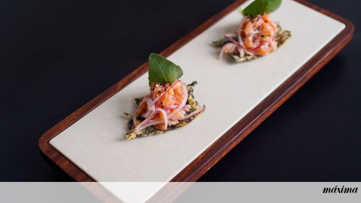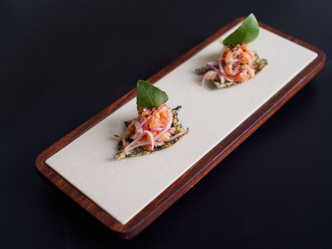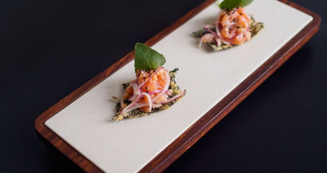 - NORI & FISH - Crocante de alga nori com salada de salmão, papaia verde, manjericão e cebola roxa marinada em ponzu.