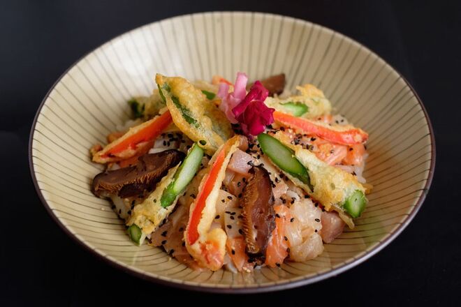 - KIGO DON - Arroz de sushi coberto com peixe, elementos da época, vinagrete de mostarda karashi e tempura de pimento.