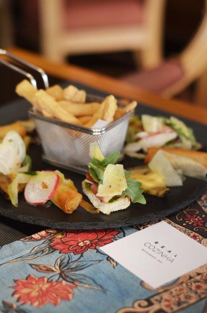 - Acepipes - Estaladiço de queijo de cabra com mel e frutos secos; Folhadinhos de farinheira com maçã caramelizada; Lâminas de choco frito com limão e molho aioli;