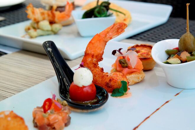 A degustação inicia com um clássico couvert de presunto bísaro que abre o apetite para o conjunto de mini entradas que compõem o primeiro prato. Destaque para a Salada de legumes mediterrânicos, Pimentos padrão, Ceviche de salmão, atum e unagui e Blini com guacamole e salmão fumado.
