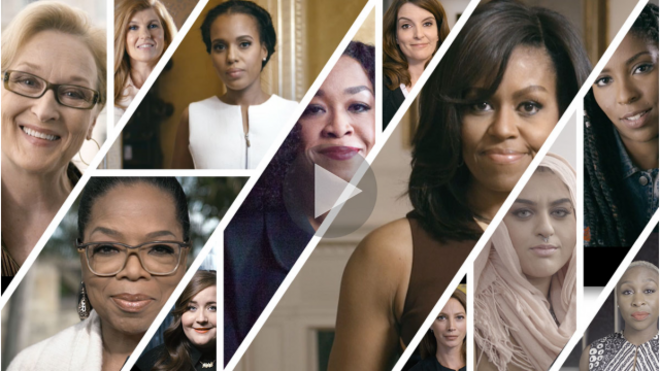 O vídeo da campanha arranca com Meryl Streep de costas e segue com rostos bem conhecidas como os de Michelle Obama, Oprah Winfrey, Tina Fey, Laverne Cox, Kerry Washington e grande parte do elenco feminino da série de Shonda Rhime 'Scandal'.