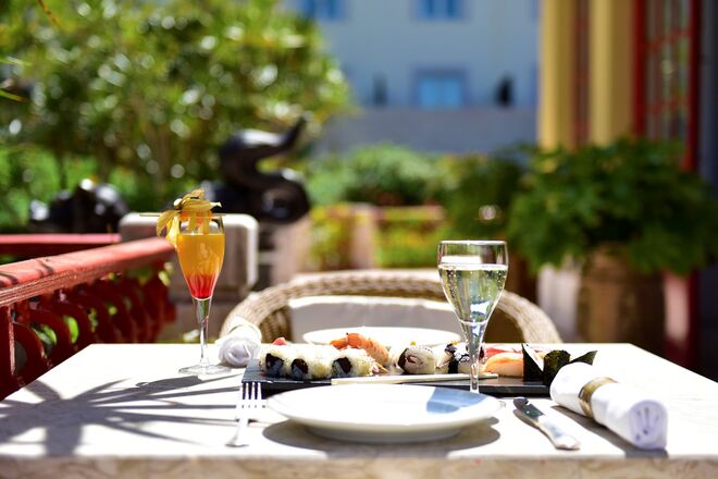 Experimente a Valle-Flôr Sangria, com espumante Murganheira, maçã, ameixa, manjericão e caramelo, ou o Red Fruit & Basil Mojito, composto por rum, soda, frutos vermelhos, xarope de gengibre, lima, folhas de hortelã e manjericão. Se preferir, opte por um Iced Palace Tea na opção Earl Grey composto por bergamota e sorbet de tangerina. De salientar que as composições a jarro do menu Coktails & Champagne são elaboradas com frutos orgânicos, ervas  do jardim do Pestana Palace e ingredientes caseiros.