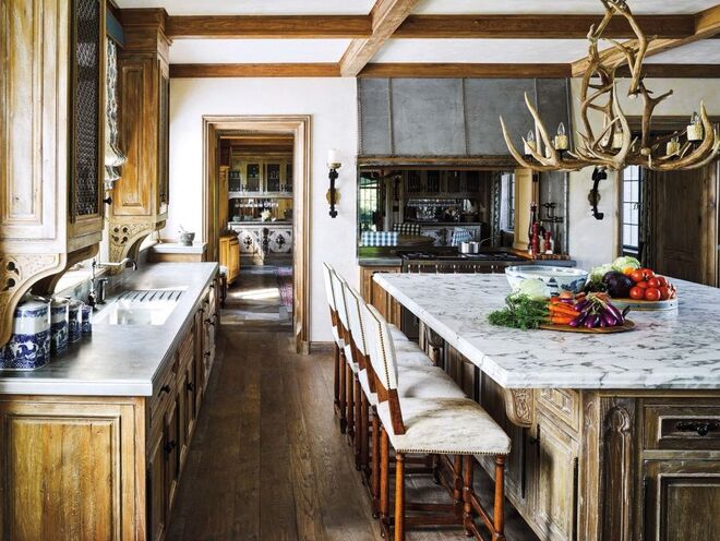 A cozinha, toda em madeira e mármore, é uma das zonas mais confortáveis da casa e foi recuperada por uma empresa de design de interiores que transformou algumas peças antigas em armários funcionais.