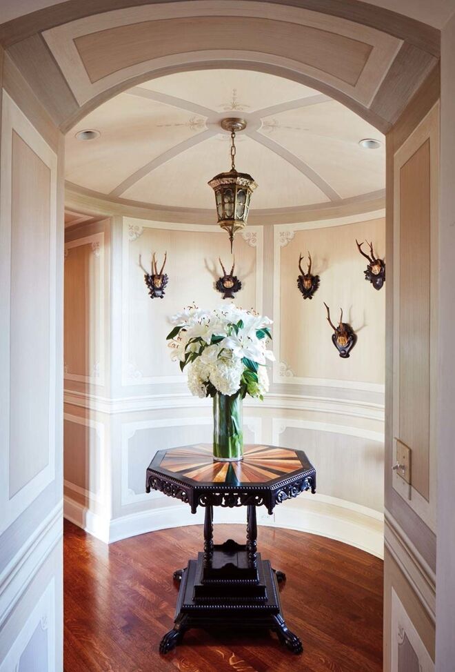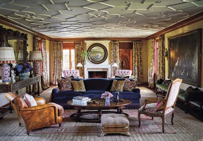 A sala principal da casa possui um teto espetacular e toda uma série de detalhes, que vão dos cortinados de Martyn Lawrence Bullard para Schumacher aos sofás de George Smith, tapetes da Clarence House e almofadas Scalamandré, provenientes de diferentes marcas, muitas delas europeias.