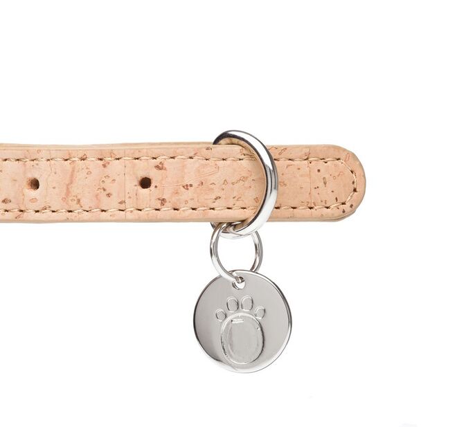 As coleiras estão disponíveis em 5 tamanhos, que variam entre os 30 e os 50cm de comprimento, com ferragens em prata e uma chapa decorativa CORKY. As trelas, com ferragem em prata, têm 117cm de comprimento e 2cm de largura.