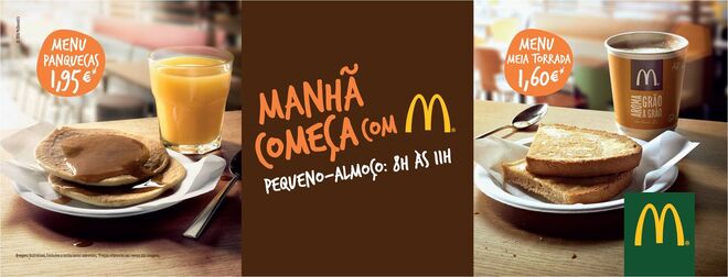 A McDonald's passa a ter disponível no seus espaços pequenos-almoços, entre as 08h00 às 11h00. A marca apresenta agora uma nova gama de produtos, composta por uma oferta tradicional portuguesa - pão de água português ou com cereais; croissants; tosta mista; torrada; - a par de produtos tipicamente americanos, como panquecas e Bacon & Egg McMuffin®. A par de tudo isso, no que diz respeito às bebidas estarão disponíveis Meias de Leite, Sumos, Café, Cappuccino, Leite, Leite com Chocolate ou Chá. Conta ainda com várias opções de menu de pequeno-almoço, desde 1,60 euros a 2,45 euros.