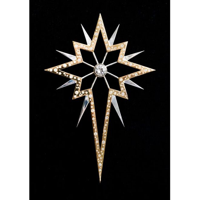 Com 20cm de altura e 13 de largura esta estrela tem 280 diamantes incrustados e pesa 130 gramas. A parte central é em prata dourada. O Diamante central pode ser transformado num colar.