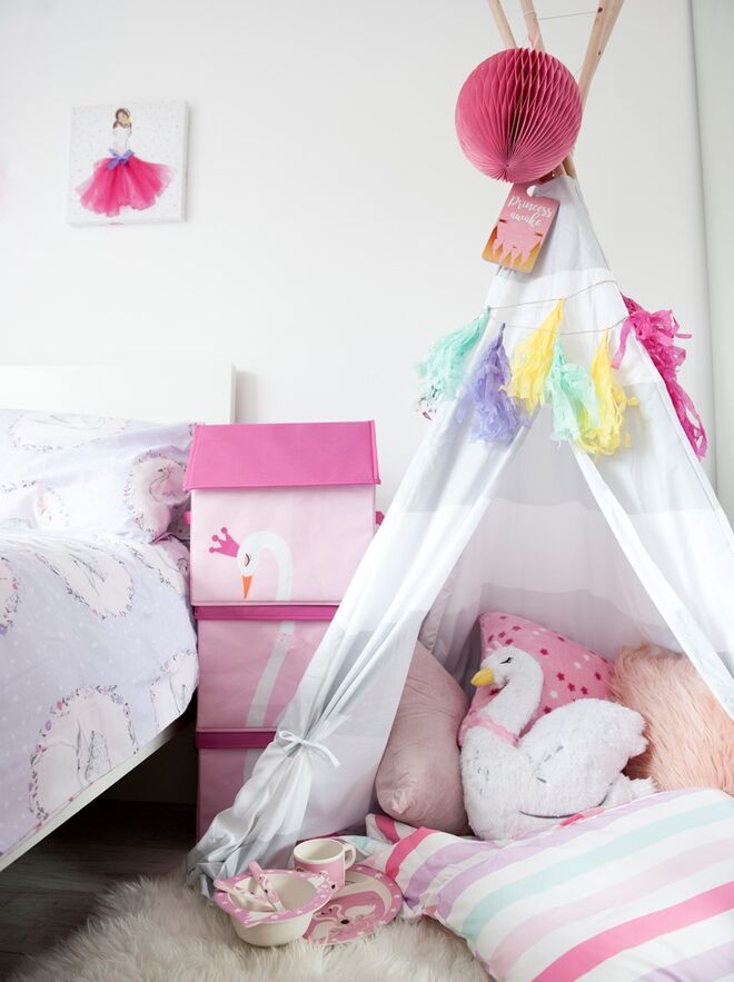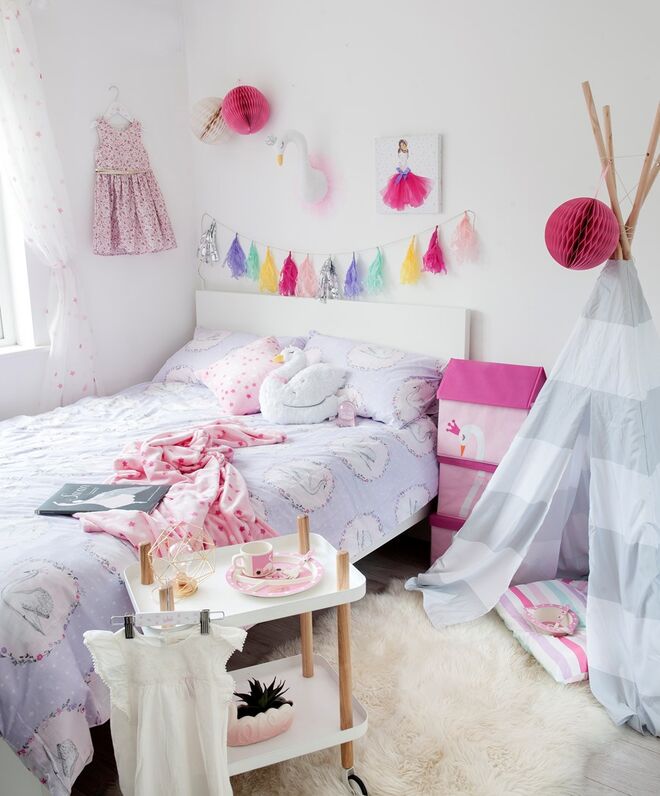 Grinaldas de papel, vinis ou cabeças de peluche divertidas são algumas das peças-chave desta linha. Mas não se esgota aqui. Existe também roupa de cama, autocolantes, tendas, caixas de arrumação, mantas confortáveis, almofadas grandes e tantos outros artigos de decoração repletos de princesas, dinossauros ou cisnes.