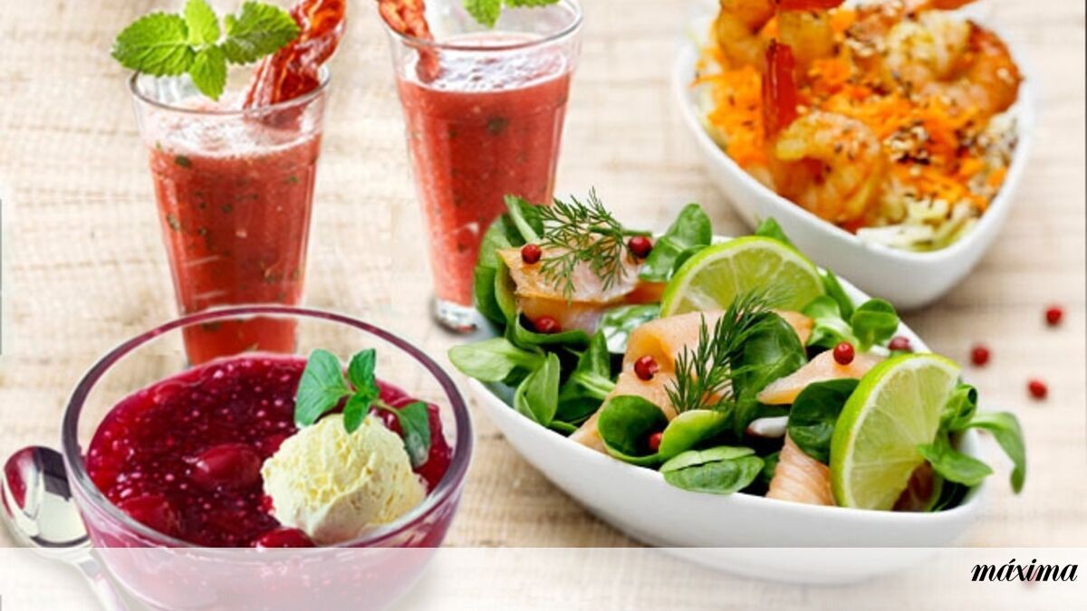 Antes de servir grelhe o bacon numa frigideira antiaderente, sem gordura, até ficar crocante. Retire o excesso de gordura com papel absorvente. Distribua o cocktail por quatro copos, decore com o bacon e com as folhas de hortelã e sirva.