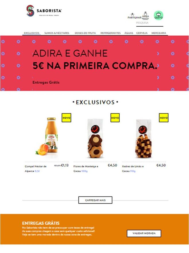 Saborista é a loja online Sumol+Compal com produtos exclusivos, preços especiais e entregas gratuitas. Para os novos clientes o Saborista oferece um presente de boas-vindas: um crédito de €5 que pode usar quando quiser. Para todos os clientes, novos e já habituais, podem cntinuar a ganhar €5 de crédito em compras no Saborista sempre que um convidado seu realizar a primeira encomenda.