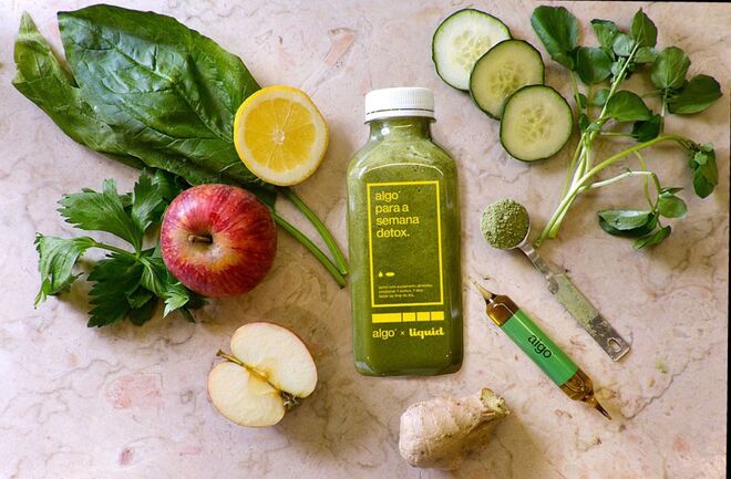 O programa detox contém espinafres, gengibre, maçã, limão, erva de trigo, aipo, pepino e agrião. a ele é adicionado uma ampola de algo® para a semana detox que contém chicória, alcachofra e colina, que ajuda na manutenção de