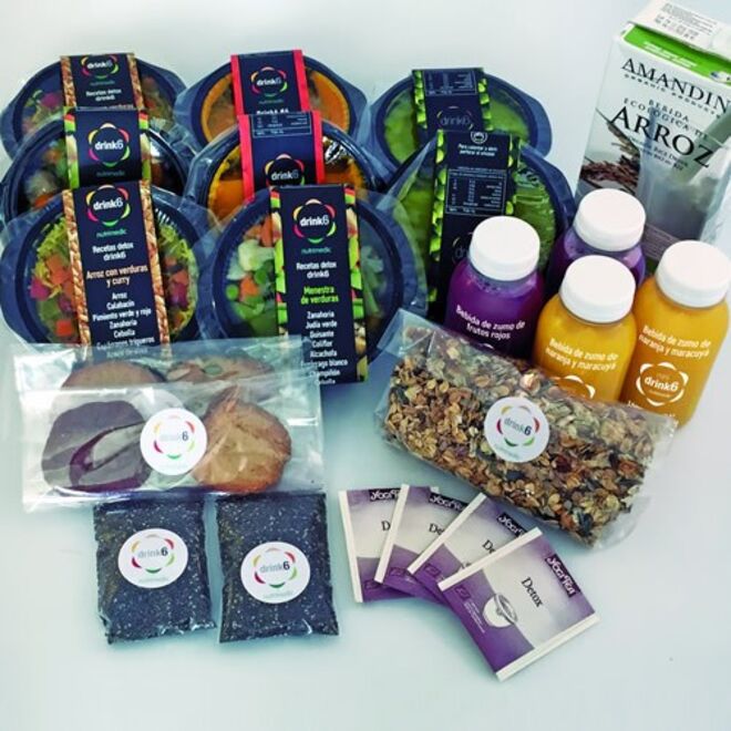 Menu detox: O Menu Detox da Drink6 está integrado por uma variedade de alimentos cuidadosamente seleccionados com tudo o que necessitas para 2 dias completos de alimentação saudável, incluindo as refeições principais e lanches. Ideal antes de realizar a dieta liquida: 4 cremes de legumes, 4 pratos preparados: saudáveis e equilibrados para aquecer e já está, 1 litro de leite de arroz, 50 gramas de sementes de chia, 200 gramas de granola, 4 bolachas veganas, 4 infusões detox, 4 sumos Mini Drink6 de 250 ml: 100% naturais e frescos. 60€ (Custos de transporte incluído).