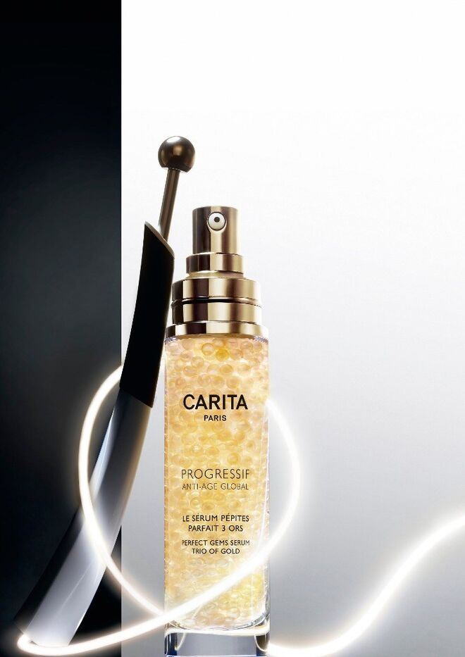 Pérolas anti-idade. Um aliado em puro ouro mineral, vegetal e biológico, Sérum Pépites Parfait 3 Ors, €300, Carita.