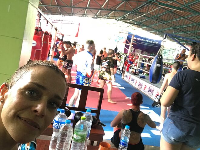 Treino da tarde começa com o aquecimento super especial. Para ajudar a passar o tempo, faço mentalmente as contas de quantos burpees, flexões, agachamentos, abdominais terei feito nestes 19 dias. São imensos vistos assim todos juntos. E nota-se, o próprio Rui me diz: "Estás mais magra e sequinha Rita, já se nota!" No final da aula, ele que parece sempre muito duro mas é um companheiro, vem dizer-me: "Boa, chegaste ao fim." E imita os tailandeses a fazerem uma massagem às costas e aos braços, como nos combates reais. Rimo-nos muito e mais uma vez penso na sorte que tenho em conviver com esta equipa Dinamite e na forma como me acolheram e acolhem todos os novos alunos, sempre prontos a ensinar um golpe, a corrigir algo, a motivar quando as forças faltam, a brincar quando estamos cabisbaixos.