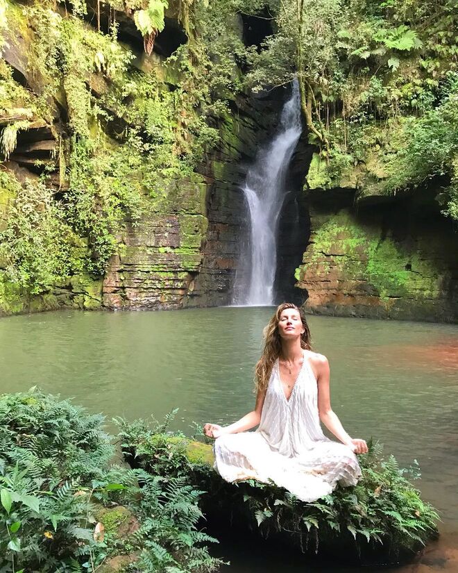 "Se eu tiver que treinar duro, eu faço um smoothie com frutos silvestres, uma colher de cacau, sementes de cânhamo, de linho, chia, uma banana, manteiga de amêndoa e proteína em pó. Tudo misturado com leite de coco. Caso contrário, mantenho a mesma dieta, com base em vegetais e frutas do nosso jardim", declarou Gisele à Vogue Paris de junho/julho. "Mas eu não sou super rigorosa também. Eu cedo a uma boa pizza e como eu não suporto o desperdício de comida, eu até termino as crostas de todo o mundo adicionando manteiga francesa. Está dito! Manteiga é o meu guilty pleasure, com chocolate negro e pipocas a ver um bom filme."