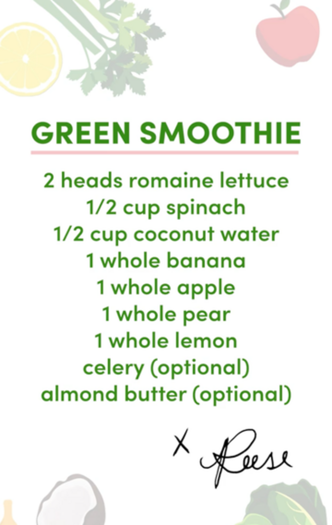A receita inclui espinafres, alface romana, água de coco, uma pera, uma maçã, uma banana e limão. No vídeo, Witherspoon sugere que se adicionem proteínas em pó, manteiga de amêndoa ou sementes de linhaça, juntamente com uma mão cheia de frutas e vegetais, partilhando a receita na íntegra. E ainda brinca: "O ingrediente secreto é que eu danço!". Witherspoon admite que este smoothie, nutritivo e proteico, é de facto o seu pequeno-almoço, pois sacia a fome até à hora do almoço.