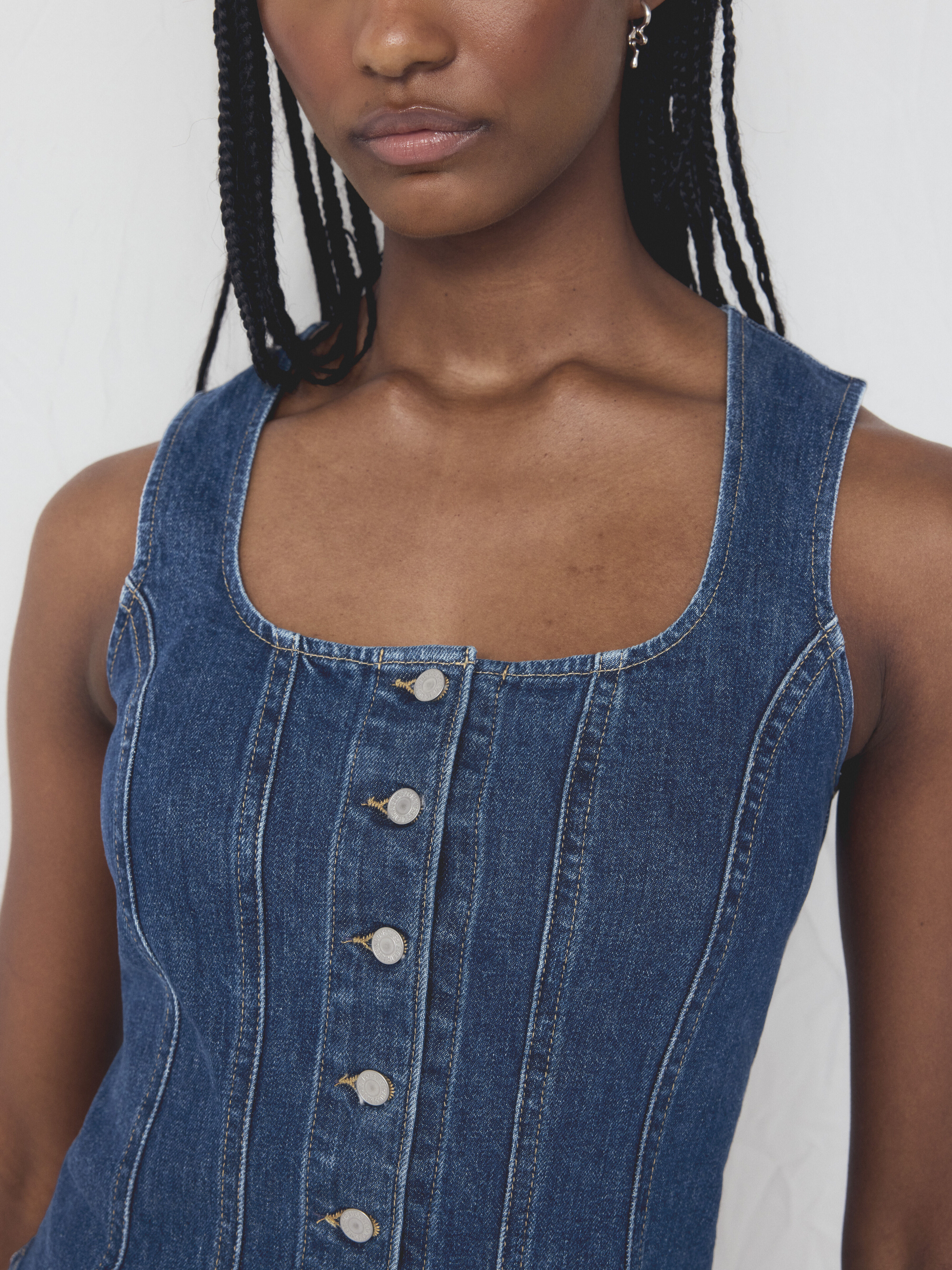 No topo, a delicadeza encontra estrutura: a Ottie Boho Blouse, a Monaco Sleeveless Blouse ou a Blair Boatneck Top convivem com peças mais marcantes como a Simone Blouson Parka ou o icónico 90’s Denim Slip Dress.