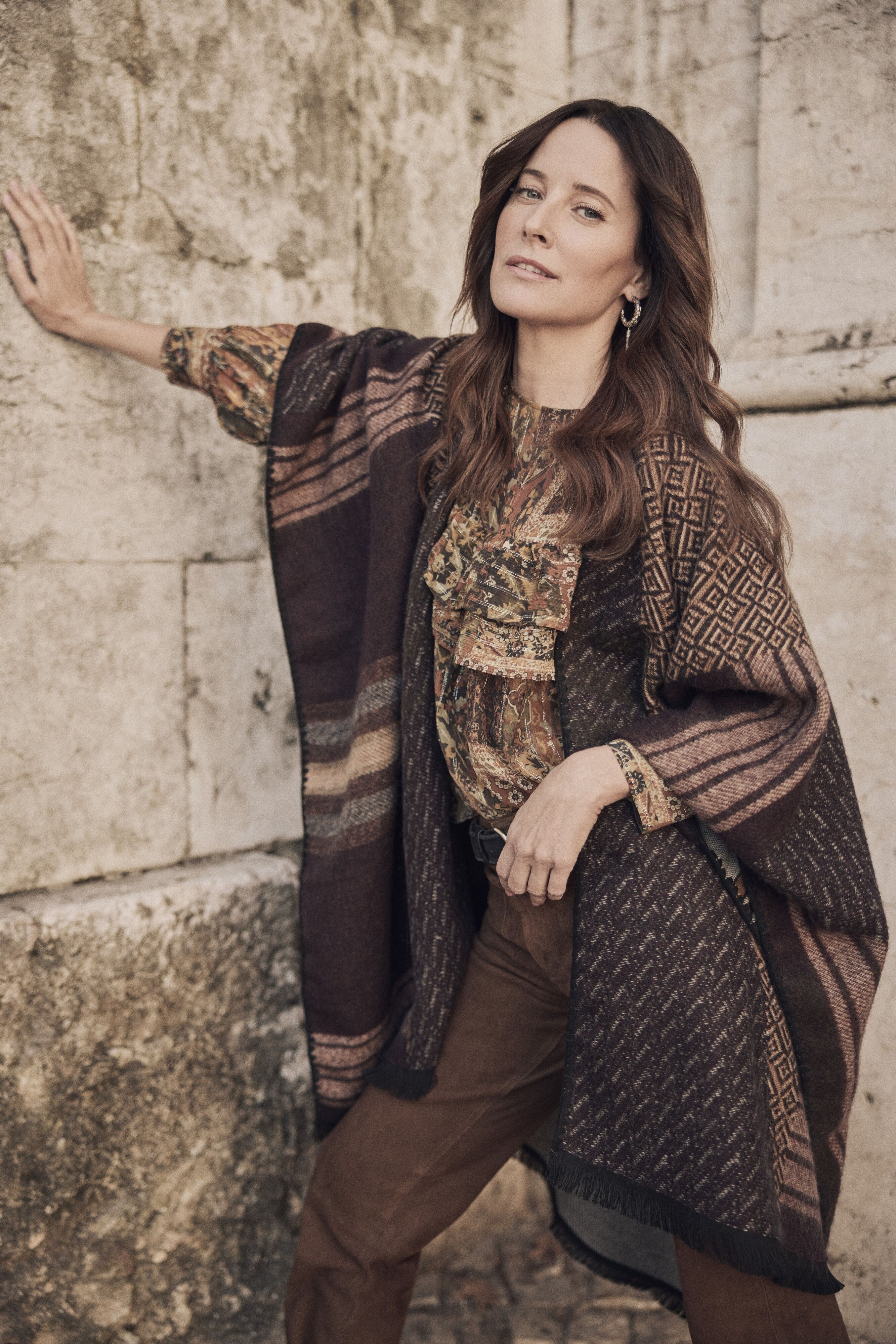 Coleção ba&sh: poncho de lã Panama, blusa viscose Pixie, calças de camurça Mossi, brincos Maddy.