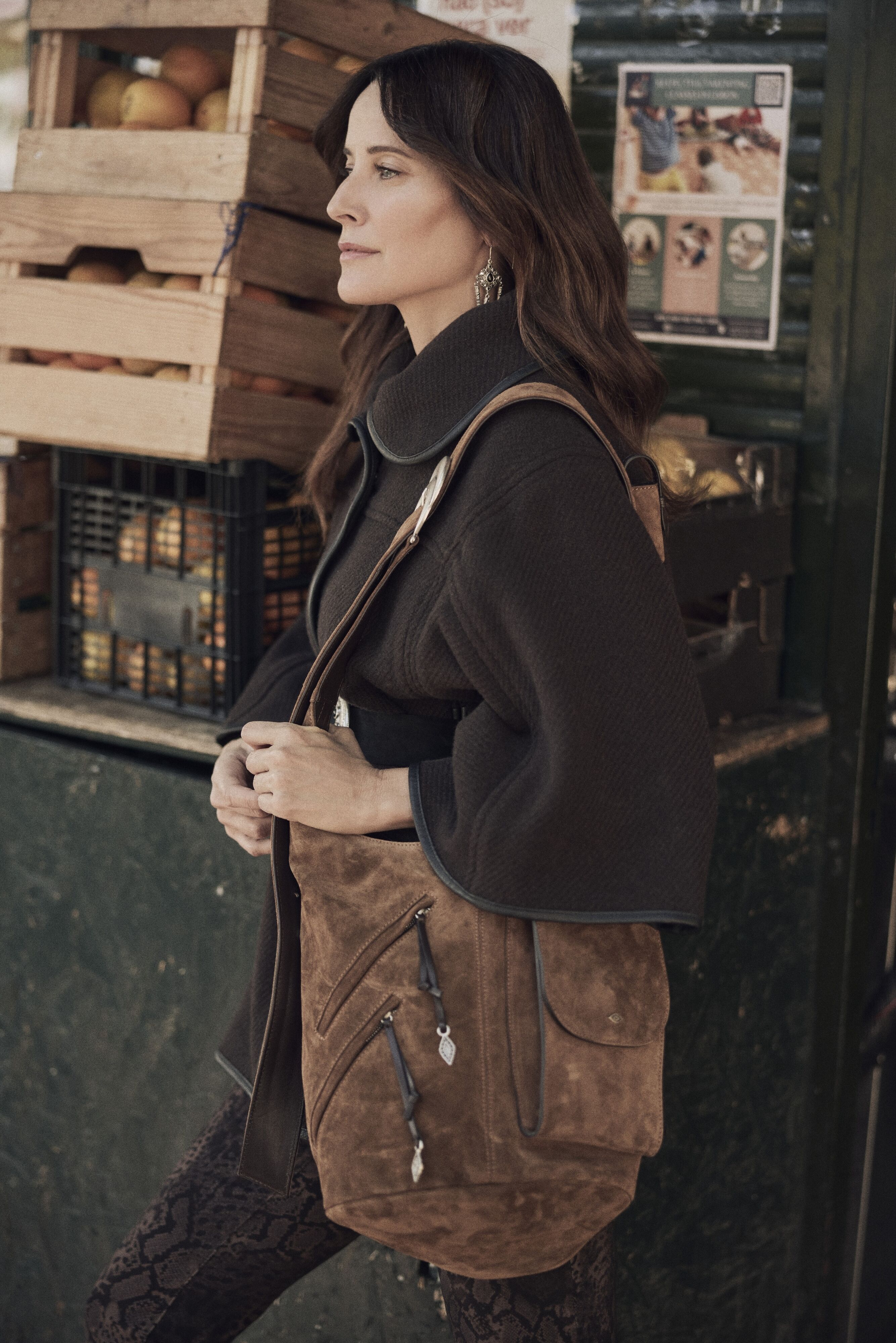 Coleção ba&sh: mala em camurça YouYou, casaco-capa de lã Sea, jeans leopardo Stinsy.