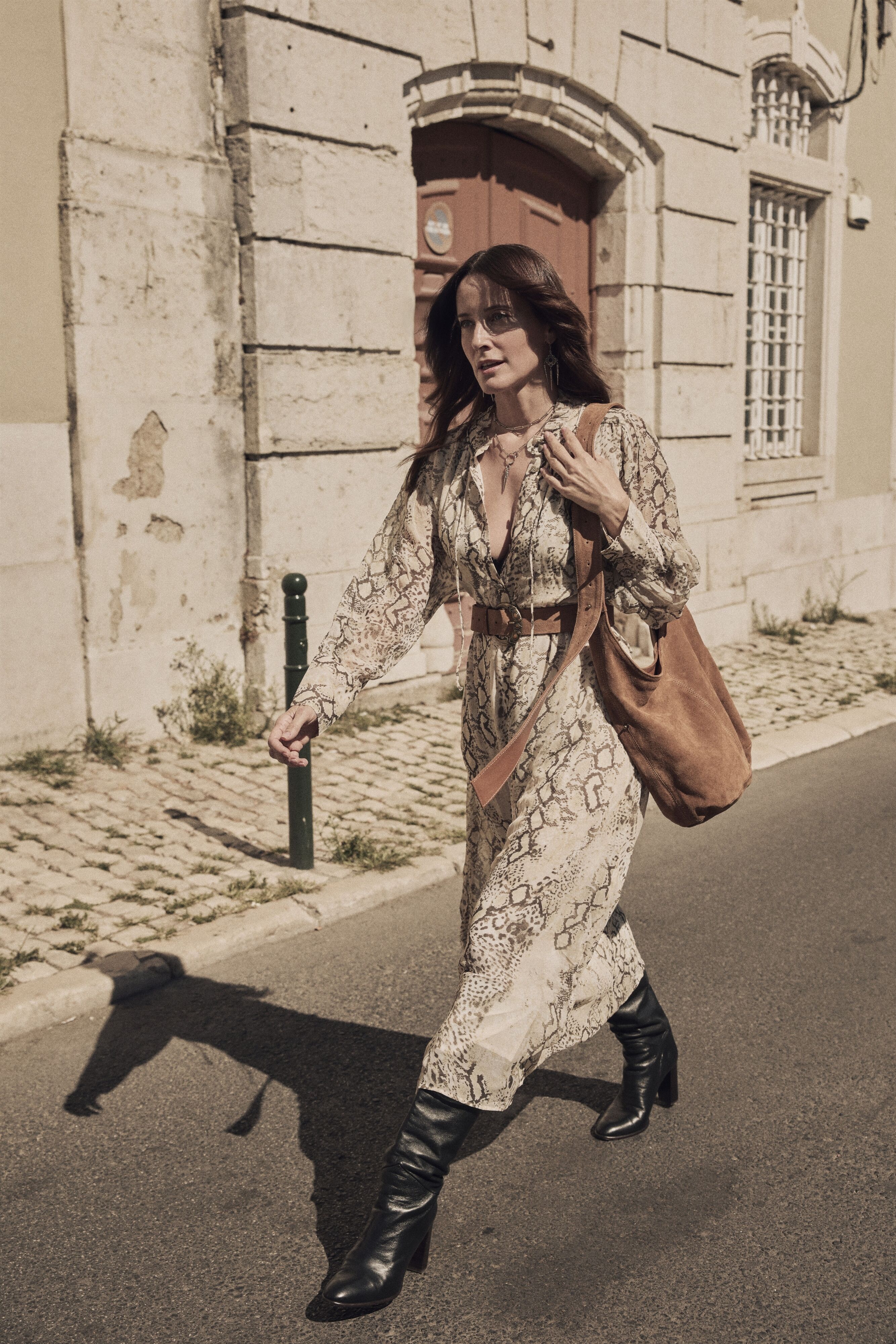 Coleção ba&sh: vestido viscose Sahara, cinto camurça Bolbi, mala em camurça YouYou, botas em pele Ciry Land.
