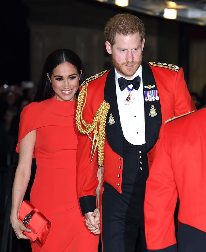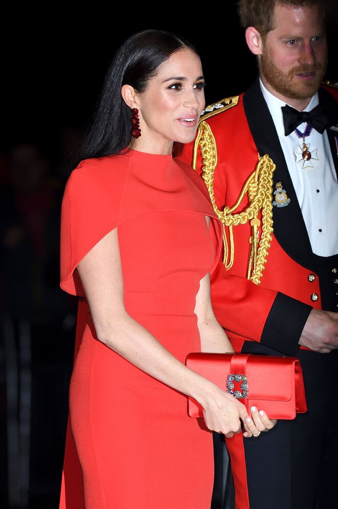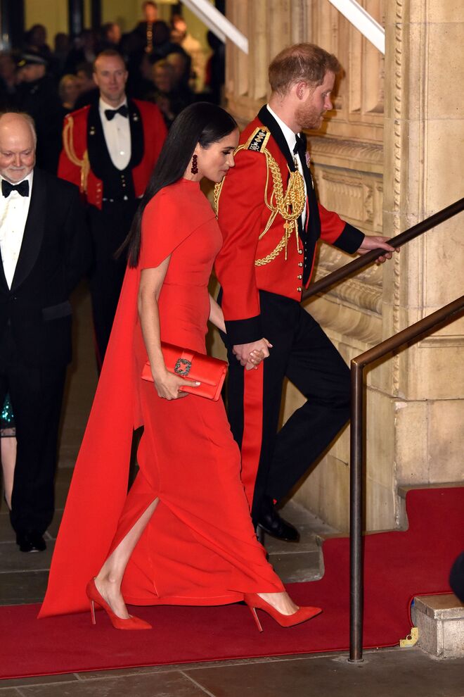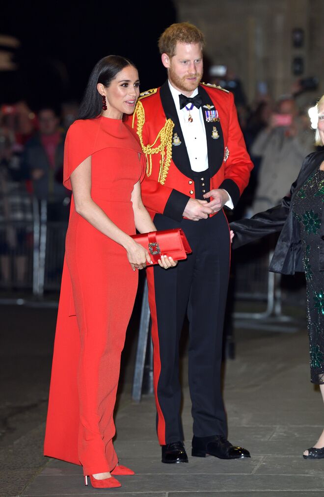 No dia 7 de março, Meghan Markle marcou presença no Festival de Música de Mountbatten acompanhada por Harry. O festival aconteceu no Royal Albert Hall, em Londres, para celebrar o 75º aniversário do fim da Segunda Guerra Mundial e o aniversário da formação dos comandos britânicos. Nesta noite, a duquesa utilizou um look vermelho, que coordenava com a farda dos fuzileiros navais do príncipe Harry – um momento histórico, pois foi a última vez que este vestiu a farda oficial da Marinha Real. O look de Meghan consistia num vestido vermelho com capa, da marca Safiyaa, que usou com uns sapatos da marca Aquazzura e uns brincos assinados por Simone Rocha.