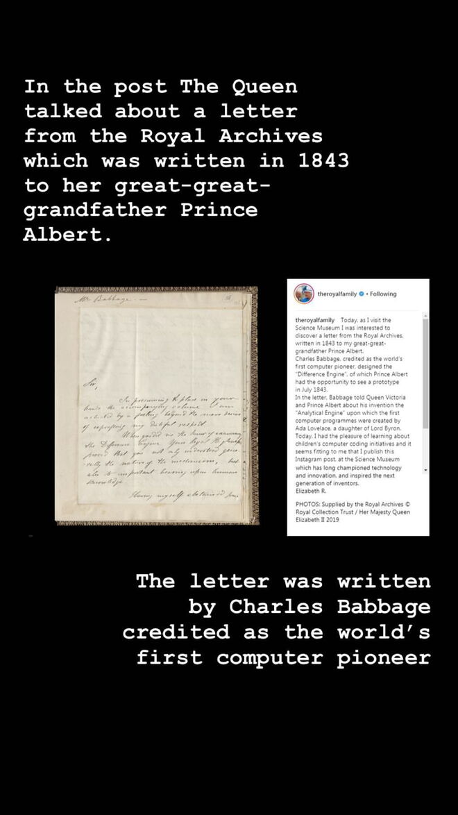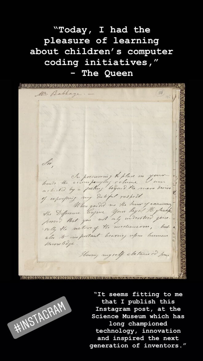 A rainha Isabel II publicou o seu primeiro post no Instagram hoje, dia 7 de março de 2019, durante a visita ao Science Museum, um dos três principais museus na Exhibition Road, em South Kensington, Londres. Aos 92 anos, a monarca britânica publicou uma carta dos arquivos reias escrita em 1843 ao seu trisavô, o príncipe Albert.