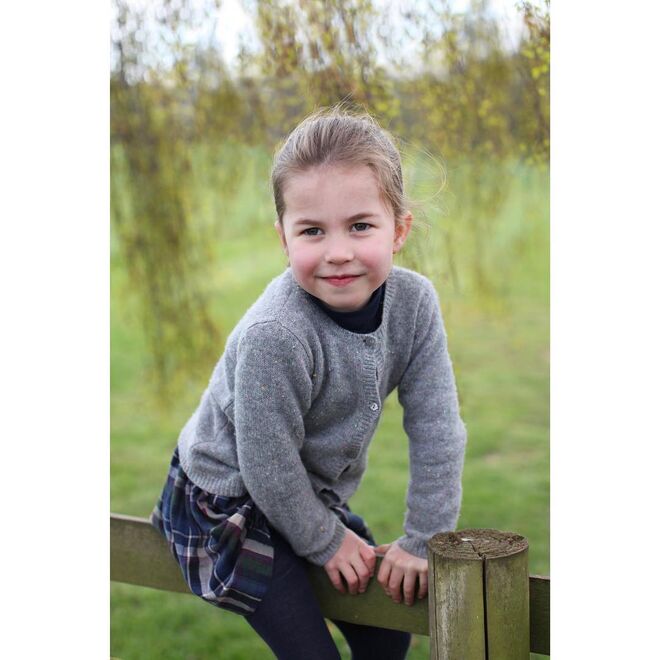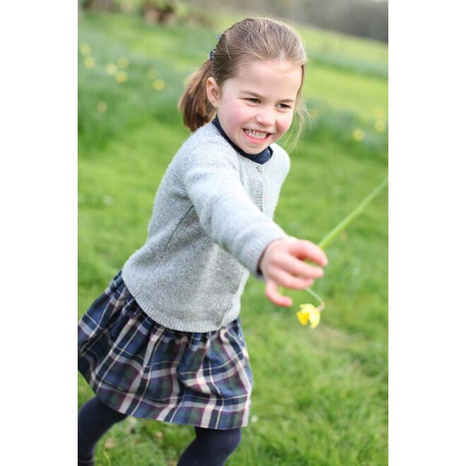 Duas das imagens são do mesmo dia, com a princesa a usar um casaco cinzento em caxemira sentada numa cerca e a brincar com um narciso. Na terceira foto, Charlotte usa um vestido azul com flores e sorri sentada na relva.