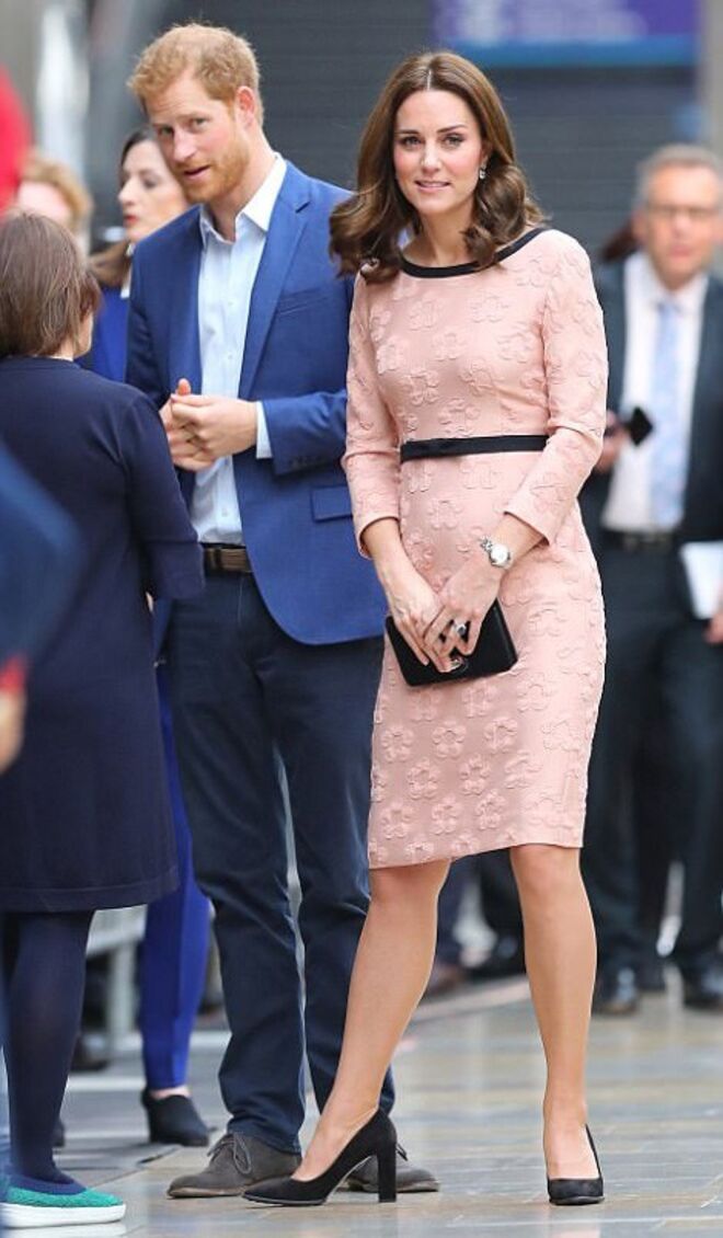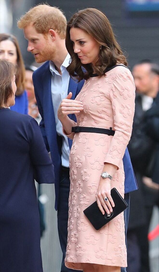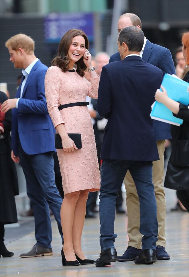 Para a ocasião, Kate escolheu um vestido rosa de Orla Kiely, através do qual foi possível vislumbrar uma pequena barriguinha.