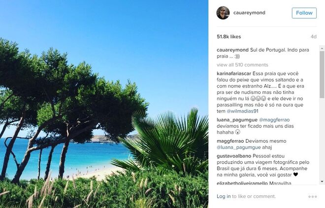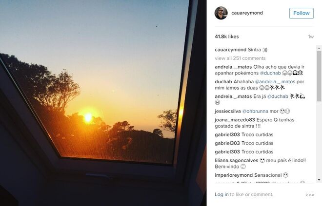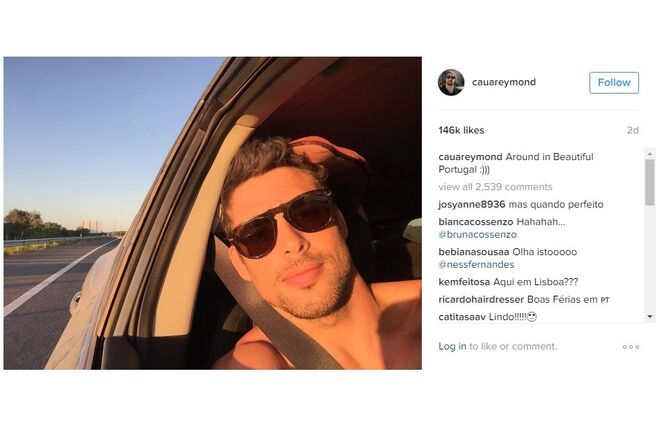 Cauã Reymond mantem-se mais discreto nas redes sociais mas o instagram de Goldfarb tem sido um verdadeiro diário de viagem, com várias fotografias por dia e muitos elogios a Portugal e à gastronomia portuguesa, sobretudo ao vinho do Porto, aos pastéis de Belém e aos bolinhos de bacalhau.