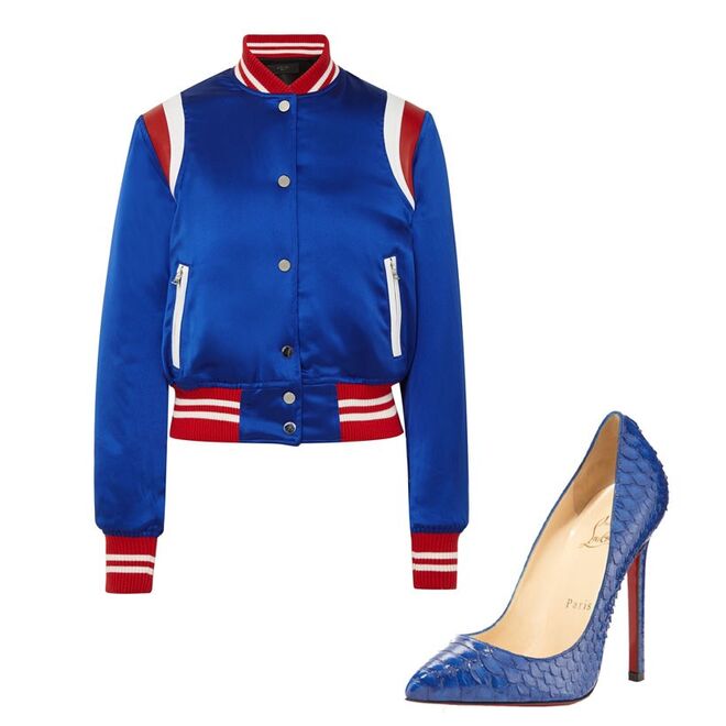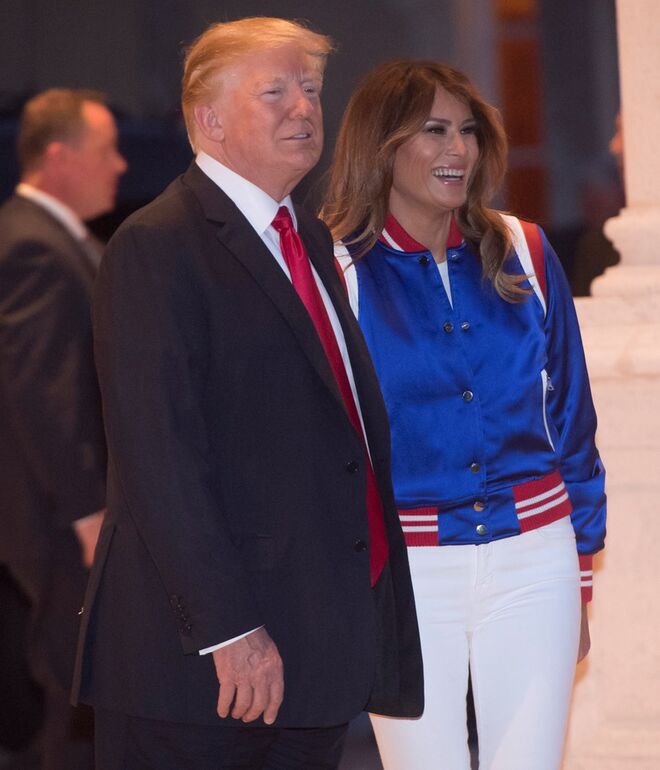 Acompanhada por Donald Trump, Melania surgiu com um bomber azul e vermelho, as cores nacionais, umas calças brancas e uns sapatos altos Christian Louboutin (azuis, com um salto de 10 centímetros). O bomber, em seda, é da marca Amiri e custa cerca de €1600, enquanto os Louboutin azul-cobalto custam €650 (e estão atualmente esgotados).