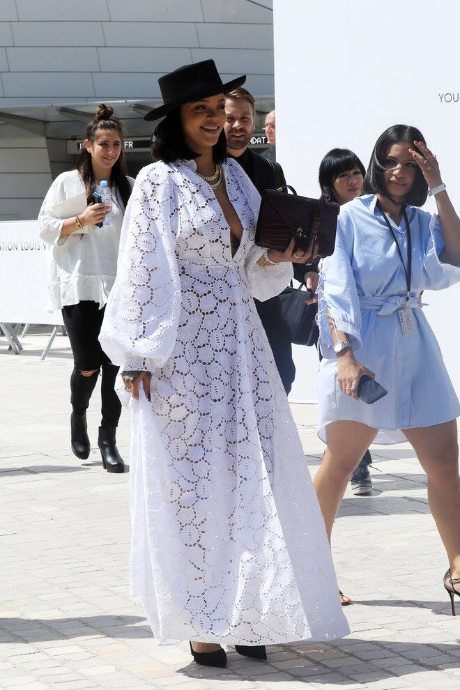 Trata-se de um vestido comprido e largo, branco, com decote em ‘V’ e uma abertura em baixo que deixa vislumbrar as pernas. Rihanna completou ainda o look com um chapéu por cima de um lenço com padrão de estrelas.
