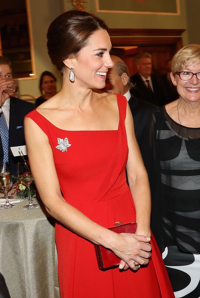 Depois de uma chegada marcante seguiu-se uma segunda aposta clássica. Na primeira noite houve uma receção na Casa do Governador, em Victoria, e a duquesa usou um vestido vermelho Preen by Thornton Bregazzi, que lembrava o estilo da década de 1950 e que foi acessorizado com a mesma pregadeira em forma de folha de acer. Esta joia foi um presente do rei Jorge VI à sua esposa, a rainha Isabel (os pais da rainha Isabel II), quando em 1939 fizeram uma visita de estado ao Canadá. Às escolhas clássicas juntam-se ainda o vestido Alexander McQueen da coleção resort 2017 na chegada a Vancouver, o vestido verde Dolce & Gabbana que a duquesa usou para visitar a Universidade de British Columbia, em Kelowna e o vestido bege See by Chloé que usou para uma festa de jardim na Casa do Governador em Victoria, junto ao príncipe William e aos pequenos príncipes de Cambridge. Na mala de viagem não podiam faltar casacos, como um casaco verde Hobbs reutilizado, um casaco vermelho CH Carolina Herrera que a Duquesa usou para caminhar pela Main Street Party, em Whitehorse, e o casaco Catherine Walker em tons de bege que a duquesa escolheu para se despedir do Canadá com toda a família. A provar ainda a sua habilidade para conseguir looks casual/chique, a Duquesa Kate optou por peças low cost nesta viagem. Para assistir a uma cerimónia de partilha cultural no Wawiskas Community Hall, em Bella Bella, a Duquesa usou uns jeans com uma camisa de xadrez e uma camisola de malha azul e botas Penelope Chilvers de cano alto. Um look que completou com um trench coat Holland & Holland para visitar mais tarde a floresta Great Bear. Em Haida Gwaii um novo look informal composto por calças justas, botas castanhas e casaco verde foi completado por uma trança no cabelo. Para visitar a instituição de Cridge Centre, no último dia de viagem, optou por peças Zara e H&M, num conjunto de calças pretas com top e blazer brancos. Além da pregadeira em forma de folha de acer, a já tradicional diplomacia com o guarda-roupa viu-se também no casaco de malha da famosa marca canadiana Sentaler que a duquesa usou com uns skinny jeans e umas botas de cano alto numa visita a Carcross.