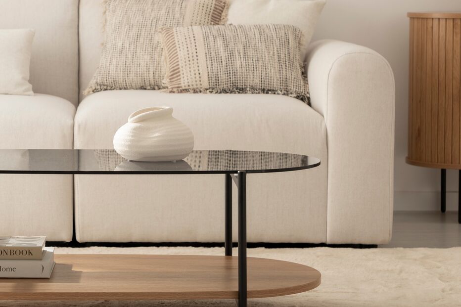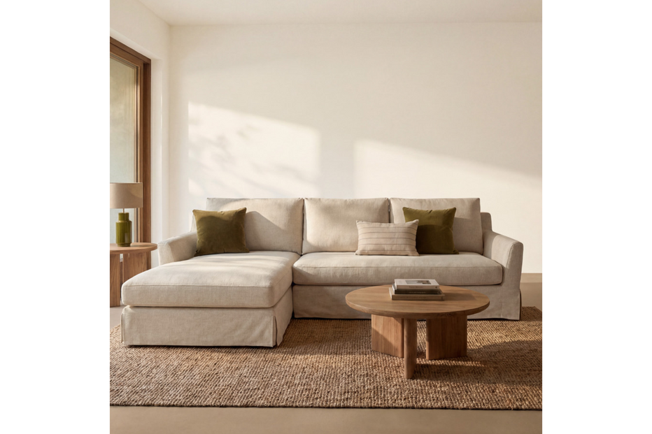 A acompanhar esta estética mais orgânica, os tons neutros continuam a dominar, especialmente em peças maiores. Um sofá com chaise longue em tons suaves, como bege, areia ou cinza claro, oferece conforto visual e versatilidade. É o tipo de investimento que permite brincar com acessórios e cores sem comprometer a harmonia do espaço. Além disso, a chaise longue reforça a ideia de relaxamento e bem-estar, essencial numa casa pensada para desacelerar.